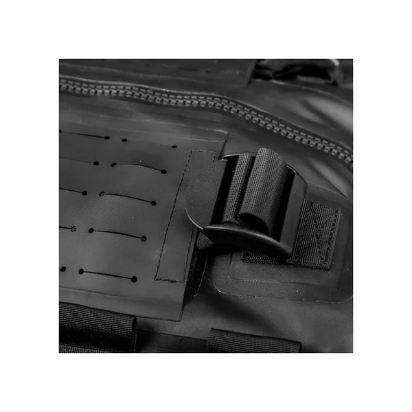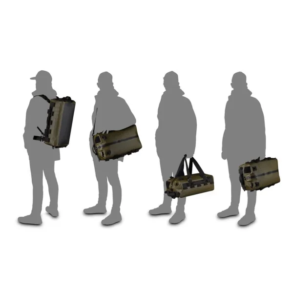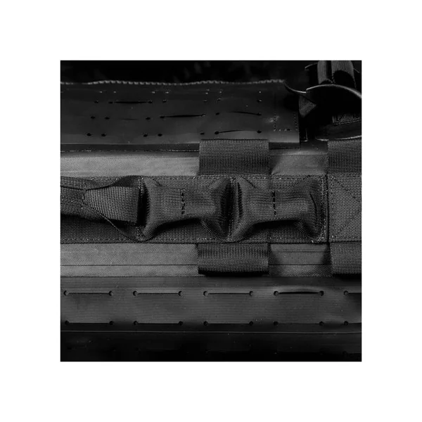 La série HYBRIDUFFLE est dotée d’empiècements de type MOLLE laser cut afin de permettre l’adjonction de poches (en particulier sur le dos du sac) et l’attache de différents objets longs : armes, pieds photos, cannes à pêche, etc. A cet effet, chaque sac est livré avec 4 sangles velcro ajustables.