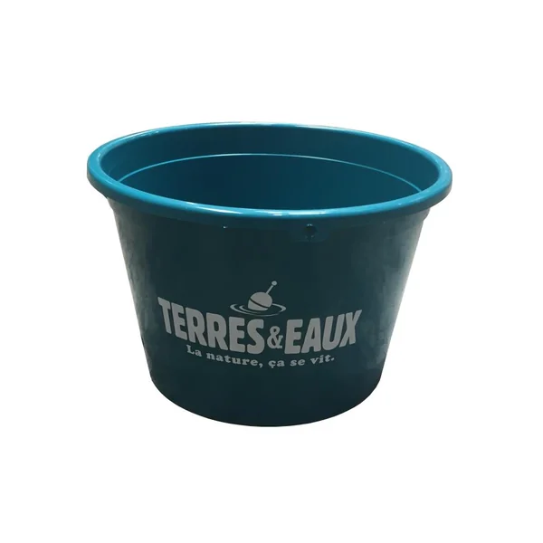 Seau de pêche 18 litres aux couleurs de Terres & Eaux, avec poignée de transport. Pour transporter et mouiller son amorce pêche au coup.
