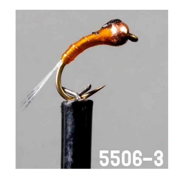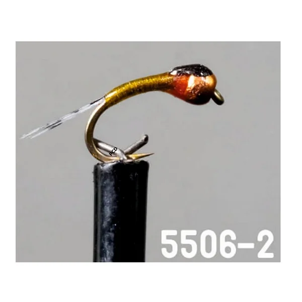 -5506-2 : Nymphe courbée légère et classée comme nymphe imitative. Montage perdigone en corps lisse marron avec cerques qui facilitent l’immersion. Complémenté d’un épaulement orange feu et d’un tag noir qui représente un sac alaire et atténue le signal de la bille et du cou. Bille en cuivre pour garder un aspect neutre. Nymphe d’ensemble proposant un aspect naturel. Taille hameçon : #16. Matière : Tungstène. Taille de la bille 2,5. Couleurs : cuivre. Sans ardillon. Poids : 0,135g.
