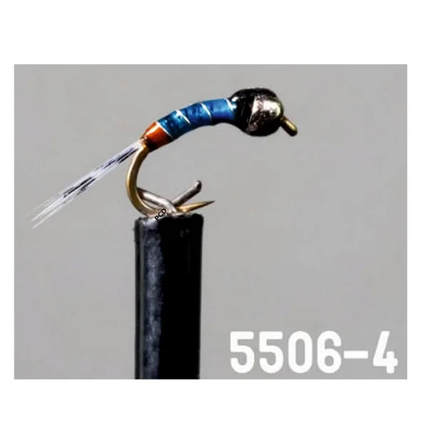 -5506-4 : Nymphe courbée légère et classée comme nymphe imitative. Montage perdigone en corps lisse bleu avec cerques qui facilitent l’immersion. Complémenté d’un épaulement noir et d’un tag noir qui représente un sac alaire et atténue le signal de la bille. Bille et cerclage fin en argent complémenté d’un hot spot (signal) orange à l’arrière pour apporter de signaux lumineux incitatifs à l’imitation. Nymphe d’ensemble proposant un aspect naturel. Taille hameçon : #14. Matière : Tungstène. Taille de la facture : 2,5. Couleur : argent. Sans ardillon. Poids : 0.130g.