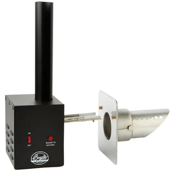 Le générateur de fumée Bradley® est une unité hautement adaptable qui vous permettra de transformer n’importe quelle petite structure en cabine de fumage. L’unité est constituée de 2 parties. Le générateur de fumée est fabriqué à partir d’acier inoxydable et rempli le même but que le générateur de fumée qui équipe les fumoirs originaux de chez Bradley®, avançant les «bisquettes » sur la plaque chauffante. Ce qui simplifie au maximum sont utilisation étant donné que les paramètres de contrôles sont limités par un bouton poussoir on/off et le bouton d’avancement de la «bisquette » utilisé afin de la positionner sur la plaque chauffante. Pour le reste, l’alimentation des bisquettes se fait automatiquement. La deuxième partie de l’appareil est constitué d’une plaque inoxydable, équipé d’un col ajustable sur lequel le générateur de fumée rentre par le biais de 2 cosses. Cela permet au générateur de fumée d’être facilement retirée de la plaquette de fixation afin d’en faciliter le nettoyage et l’entreposage. L’idée est de maintenir en permanence la plaquette à la structure utilisé pour le fumage.