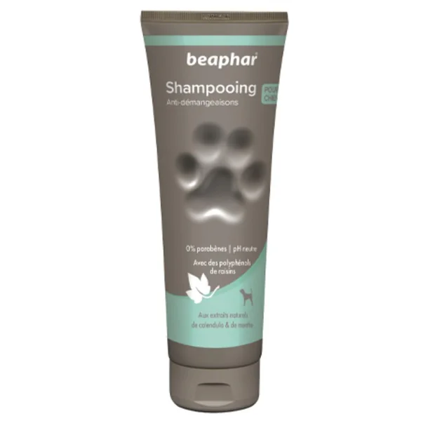 Élaboré par des vétérinaires, le shampooing anti-démangeaisons de Beaphar est idéal pour les chiens ayant des problèmes d’irritations de peau et pour ceux sensibles aux piqûres d’insectes. Il contient du calendula, fleur utilisée pour ses propriétés apaisantes et cicatrisantes et de la menthe, utilisée pour ses vertus calmantes. Ce shampooing restructure les poils cassants et hydrate les peaux les plus sensibles. Il soulage immédiatement les démangeaisons et laisse un épiderme durablement apaisé. Son pH neutre respecte l’épiderme.