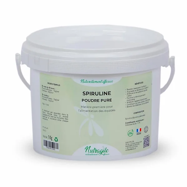 La Spiruline Poudre Nutragile est un super-aliment naturel, riche en protéines, minéraux et antioxydants, qui soutient la vitalité, la récupération et les défenses immunitaires de votre cheval au quotidien. Renforce la masse musculaire et la récupération grâce à sa teneur exceptionnelle en protéines et acides aminés essentiels. Améliore l’oxygénation et l’endurance en favorisant la production de globules rouges et blancs. Soutient les défenses immunitaires grâce à ses antioxydants naturels et à la phycocyanine. Aide à la détoxification de l’organisme, en éliminant les toxines et en soutenant la circulation sanguine. Apporte tonus et énergie sans excès de sucre ni substances dopantes. Polyvalent : adapté aux chevaux de sport, en convalescence ou vieillissants. Conditions d’utilisation : En cure de 30 jours: Poulains / Poneys: 15 g / jour