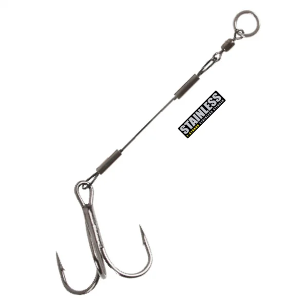 Ce stinger est constitué d’un fil inoxydable à 7 brins recouvert de nylon, d’un émerillon BFT Crank en acier inoxydable et de sleeve recouvertes de plastique. Les stingers de chez CWC sont équipés d’un anneau brisé aplati 2X-Strong qui permet une transition en douceur vers une tête plombée ou une tête à visser.