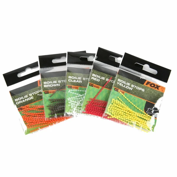Stop bouillettes, très polyvalents et économiques, de marque FOX, disponibles en plusieurs couleurs pour assortir à vos appâts.