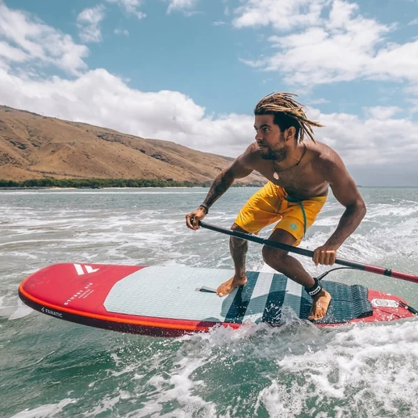 La longueur de la planche de stand up paddle aura un impact sur sa glisse/vitesse et sur les virages. A l’inverse, une planche plus longue sera un peu plus stable du fait que le volume global est plus important, cependant la largeur aura plus d’impact sur la stabilité du stand up paddle. La largeur donc détermine la stabilité de la board. Cependant, d’un point de vue performance, une planche plus large perdra à la fois en prise de vitesse et en aisance pour tourner c’est pour cela que le SUP gonflable Fanatic Stubby 8.6 a été créé avec une largeur de 29.5″ (74.9 cm).