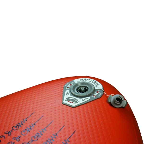 Un schéma présent sur le contour de la valve montre la manière dont il faut utiliser le bouton poussoir pour gonfler ou dégonfler la planche. Il indique également la pression de gonflage maximum préconisée.