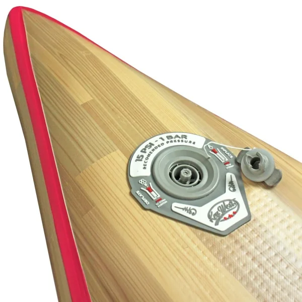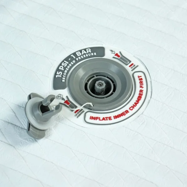 Un schéma présent sur le contour de la valve montre la manière dont il faut utiliser le bouton poussoir pour gonfler ou dégonfler la planche. Il indique également la pression de gonflage maximum préconisée.