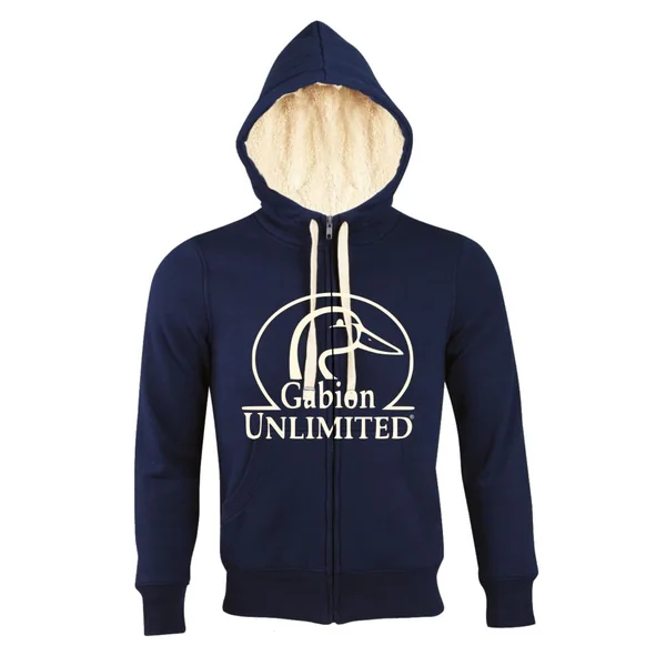 Sweat zippée à capuche avec logo de la marque Gabion unlimited sur le devant.