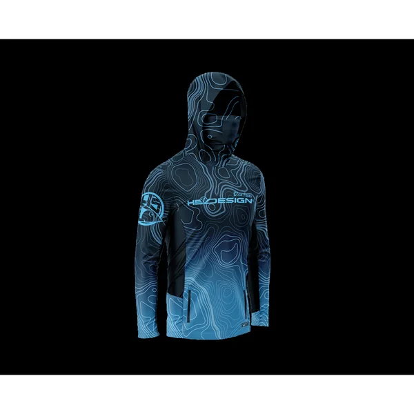 Le t-shirt UV Hooded Ocean Performance Bathymetry de la marque Hot Spot Design est un t shirt à manche longue conçu pour vous protéger du soleil et des UV. Ce t-shirt est équipé d’un masque facial intégré avec un tissu en maille de ventilation qui protège votre nez, votre bouche et votre cou.