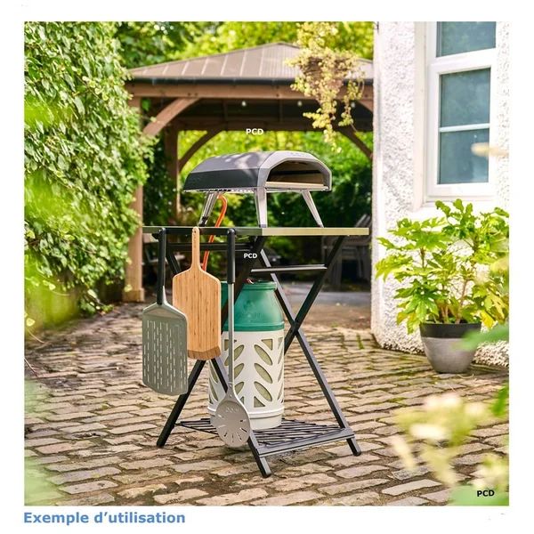 Elle est équipée d’une étagère intégrée ainsi que d’un kit de crochets Ooni pour suspendre vos accessoires et ustensiles.