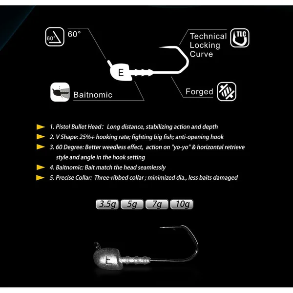 - Baitnomic : Système d’accroche permettant une bonne accroche du leurre souple sans le déchirer.