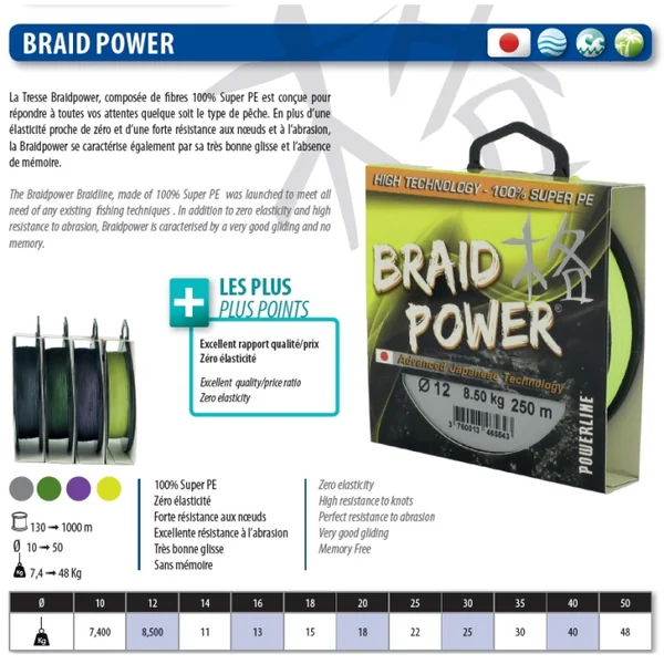 En plus d’une élasticité proche de zéro, d’une forte résistance aux noeuds et à l’abrasion, Braid Power se caractérise également par sa très bonne glisse et son absence de mémoire.