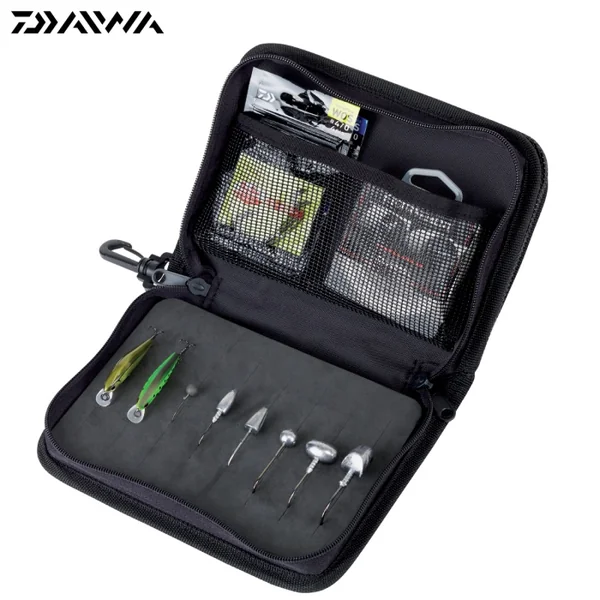 Le premier volet comporte trois logements pour les pochettes de leurres souples, l’autre face est équipée d’une plaque de mousse permettant l’organisation en toute sécurité des têtes plombées sorties de leur emballage ainsi que d’une poche filet pour les petits accessoires. Caractéristiques Trousse à Têtes Plombées Daiwa