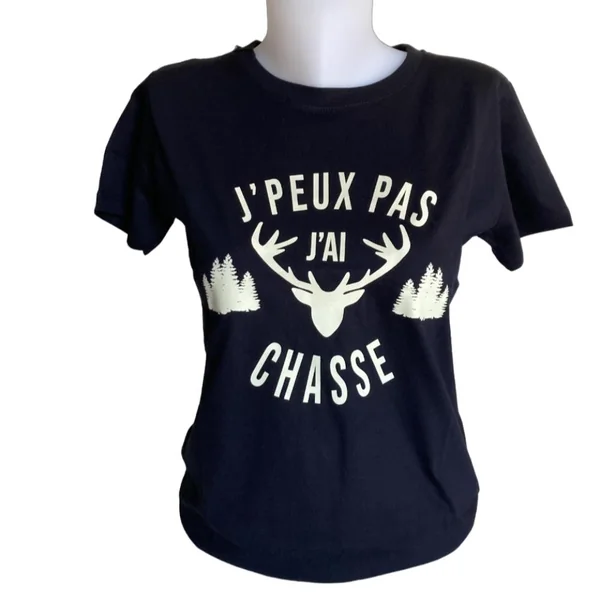 Le T-shirt femme à manches courtes « J’peux pas j’ai chasse », de coloris noir, ravira toutes les chasseresses. Parfait pour être porté à la chasse, c’est le cadeau idéal à offrir ou à s’offrir.
