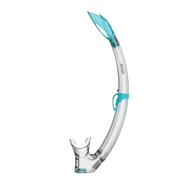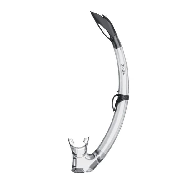 Tuba Seac sub Tribe Tuba avec système anti-clapot et soupape de purge. Corps en technopolymère et polycarbonate, embout en silicone liquide. Le volume intérieur réduit du tube diminue la quantité d’air expiré riche en dioxyde de carbone, ce qui le rend particulièrement bien adapté aux enfants et aux personnes de plus petite stature.