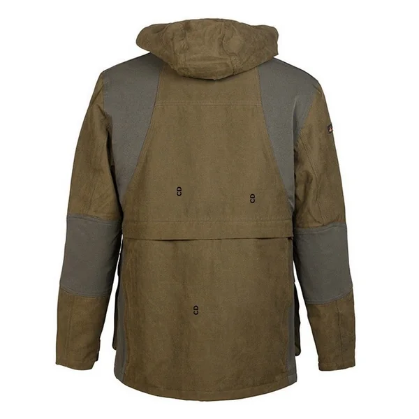 Deux poches poitrine avec zip étanches, poches repose mains, 2 grandes poches basses à soufflets avec 2 rangées de cartouchières intégrées et pattes de maintien d’ouverture.